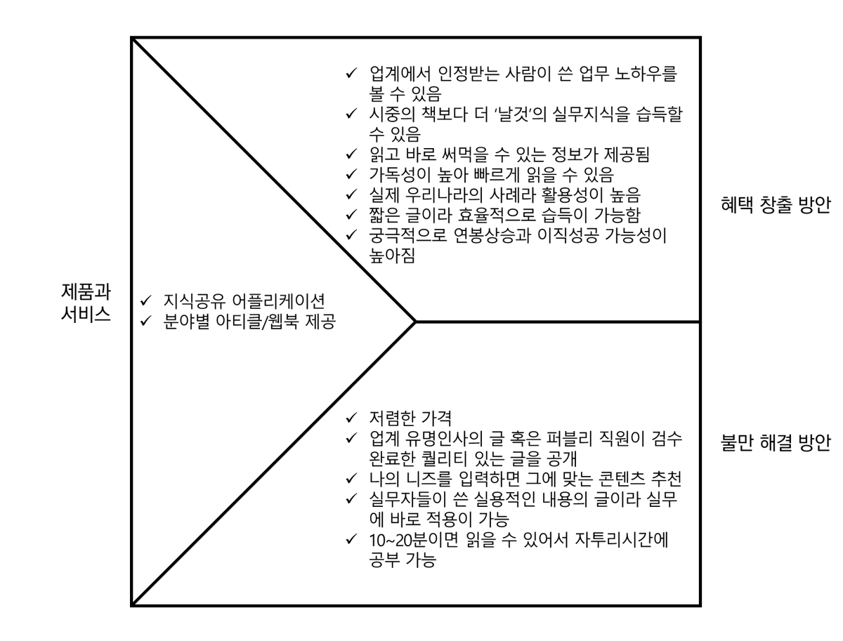 퍼블리는 '지식공유 어플리케이션, 분야별 아티클/웹북'을 고객에게 제공한다. 퍼블리가 제공하는 가치가 고객의 어떤 문제를 해결하고, 고객의 어떤 니즈를 충족시키는지는 위의 '가치맵'에 명시했다.