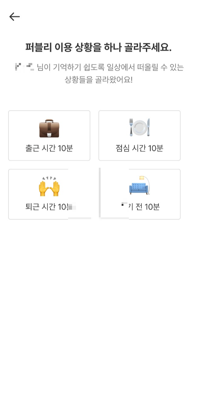 퍼블리의 주요고객은 회사원이며, 퍼블리가 제공하는 서비스는 '바쁜 사람이 자투리시간에 공부하기 좋은 콘텐츠'다. 이러한 점에 착안하여 '바쁜 사람이 어떻게 일상에서 잊지 않고 퍼블리 읽기를 실천할 수 있을까?'를 고민하다가 알림 기능을 만들게 되었다. 퍼블리의 알림시스템은 단순히 알림만 설정하는 것이 아니라 친절하다. 출근, 점심, 퇴근, 자기전 이 네가지 상황 중 하나를 고르고 그에 따른 요일과 시간을 설정하게 되어 있다. 이는 바쁜 생활 속에서도 퍼블리 콘텐츠 읽기를 잊지 않게 해주며 하나의 루틴이 되어 지속적인 멤버십회원으로 남게 될 확률을 높힌다.